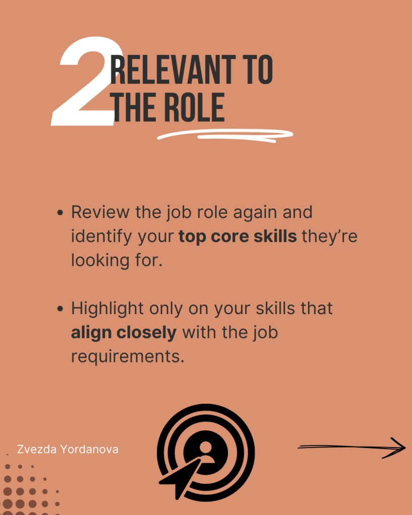 - Идентифицирайте тези умения, които са най-релевантни за позицията и дайте кратки конкретни примери от предишен опит, които са свързани с ролята, за която кандидатствате.