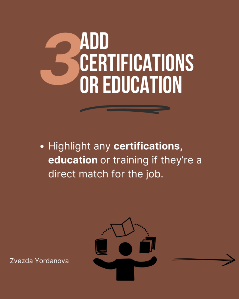 - Не се притеснявайте да споменете сертификати, образование или изкарани релевантни курсове