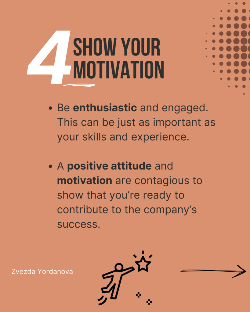 - Изразете искрен интерес към компанията и покажете мотивация.