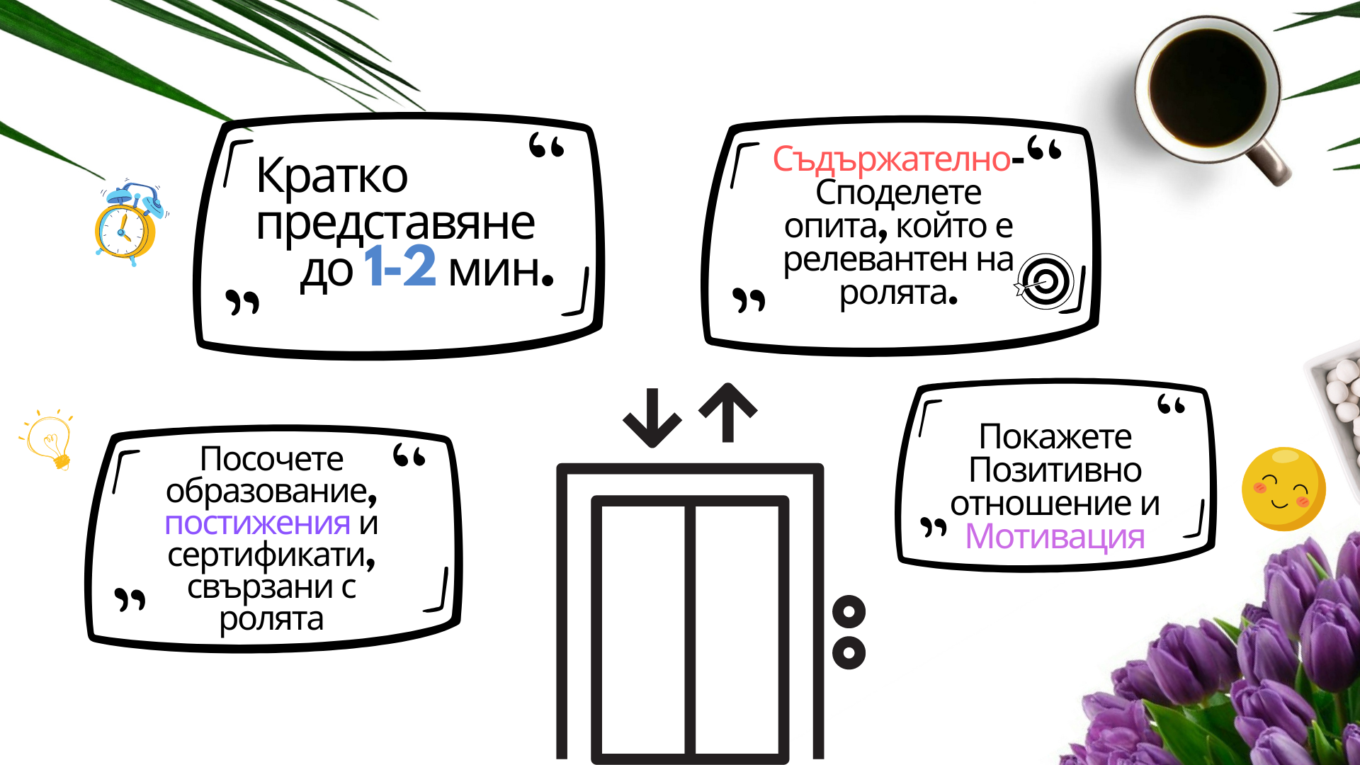 Вероятно сте чували за т.н. “Elevator pitch”. Това е метод, който може да използвате винаги, когато трябва да опишете нещо бързо и ефективно. Може да е кратко и съдържателно представяне на себе си, вашия бизнес, продукт или идея, което може да бъде споделена в рамките на няколко секунди, колкото е времето, в което бихте пътували в асансьор с потенциален клиент от 1 до последния етаж. Обикновено е с дължина до 2 минути, като целта е да грабне вниманието на слушателя и да го заинтригува, така че да иска да научи повече. Когато си подготвяме кратко представяне на себе си, всъщност си подготвяме нашия “elevator pitch”.